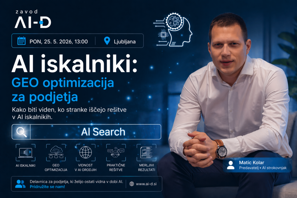 Matic Kolar, direktor podjetja Web Center in strokovnjak za SEO in GEO optimizacijo, bo na delavnici 25. 5. 2026 (pondeljek) predstavil, kako lahko podjetja vplivajo na to, kaj UI »ve« o njih in kako naj prikaže v odgovorih.